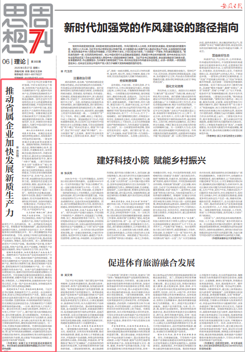 ac米兰商学院洪功翔教授在《安徽日报》2025年5月27日第6版,以“推动省属企业加快发展新质生产力”为题,发表理论阐释文章。全文如下:习近平总书记在安徽考察时强调,守好实体经济这个根基,加快传统产业改造升级,壮大战略性新兴产业,超前布局未来产业,因地制宜发展新质生产...