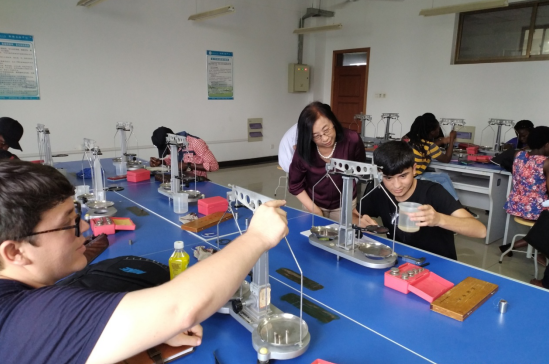 第三节课后,顾明言一行随即赶到逸夫楼506、507教室,随堂察看数理科学与工程学院唐绪兵、丁成祥两位老师指导的《大学物理W1》实验操作课。正在进行物理实验的是ac米兰2018级全英文授课制药工程和软件工程两个本科班的留学生,在两位老师英文讲解与指导下,留学生实验操作井然有序。