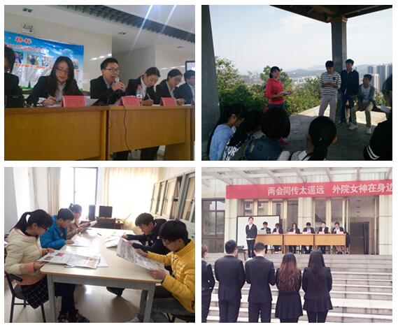 1“两会同传?这可是个新鲜事儿” 。两会期间,外国语学院在秀山校区新大学生活动中心举办了一次别开生面的“两会同传模仿秀”活动,“发言人”、“同传”、“记者”原汁原味呈现了李克强总理答记者问的精彩片段。冶金工程学院班级团支部利用微博和微信平台“两会”相关主题讨论,让团员青年更加便捷地了解学习“两会”会议精神,积极发表意见和想法。机械工程学院开展“两会你我谈”学习讨论会,同学们纷纷各抒己见,交流两会精神,碰撞思想火花,进一步加深了对“两会”思想的领悟与传递。计算机科学与技术学院、商学院组织开展以“学习两会精神,关心国家发展”为主题的座谈研讨会,将两会精神深入到每位团员青年心中。建筑工程学院团委学生会通过户外交流的方式学习讨论“两会”,开展两会热点问题知识竞答活动,营造活跃的交流气氛,大家畅所欲言,在探讨过程中完善了自我对历史使命和时代责任的认知,坚定了努力提升自我奉献社会的信念。两会期间,校团委微信平台就“两会”的相关新动态进行宣传,通过线上线下途径组织青年团员关注“两会”进程,积极对“两会”议题进行转评。