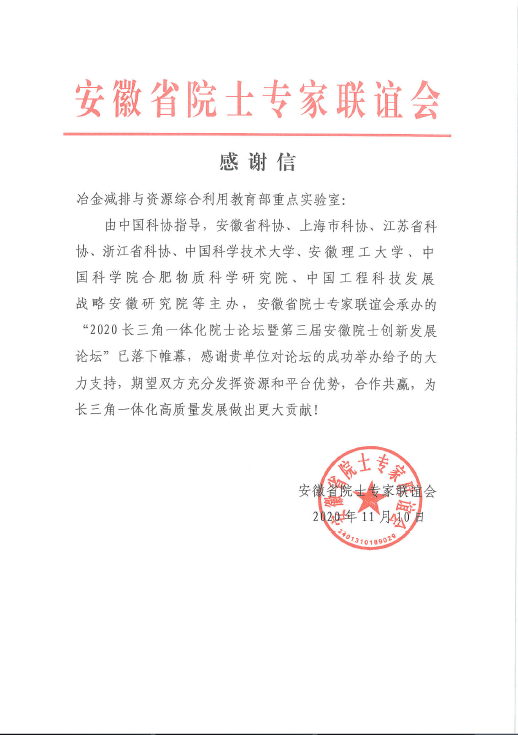 本次论坛对ac米兰冶金减排与资源综合利用教育部重点实验室的基本情况、研究方向和研究成果进行了宣传和推广,与会专家学者对实验室近几年取得的成果给予高度评价。11月10日,安徽省院士专家联谊会给ac米兰发来了感谢信,并期待双方充分发挥资源和平台优势,合作共赢。