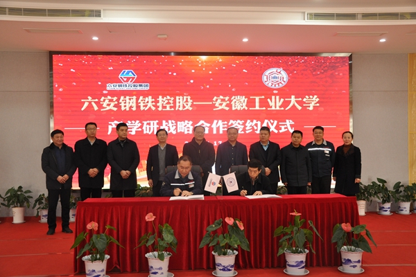 1月17日,校党委书记刘新跃、校长魏先文率队赴六安钢铁控股集团出席产学研战略合作签约仪式。副校长水恒福,党办校办、科研处、冶金工程学院等部门负责人出席了签约仪式。六安市市委常委、副市长束学龙,六安钢铁控股集团党委书记、董事长王建兵,霍邱县副县长赵德军以及六安市、霍邱县相关部门负责人参加仪式。