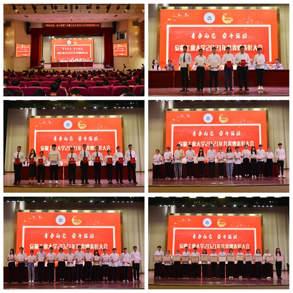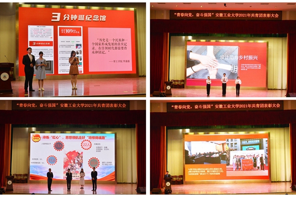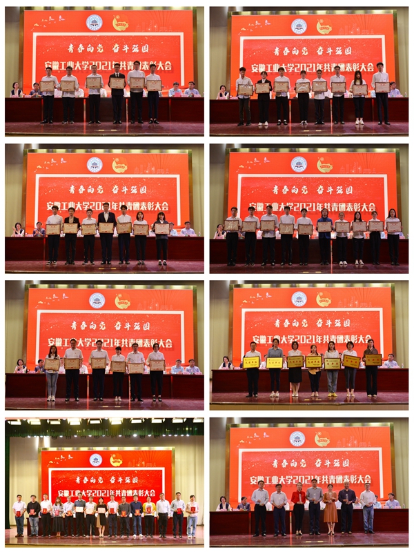 会上,安徽省十佳大学生、校十佳大学生、优秀团员团干、五四红旗团支部、共青团工作先进单位、优秀学生会、十佳社团等先进集体和个人受到表彰。校大学生宣讲团、全国暑期“三下乡”社会实践优秀团队“印象·安徽”文创产品设计实践队、全国高校“阅读推广”优秀学生社团图书馆志愿者协会、校五四红旗团支部电气工程及其自动化172团支部分别作了团队风采展示。