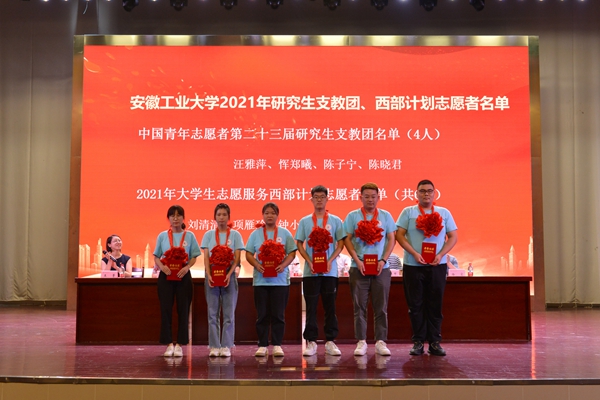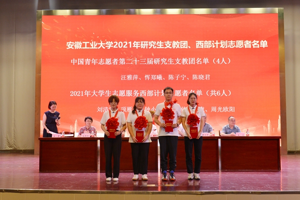 主席台领导为安徽省“挑战杯”红色专项实践活动一等奖获奖代表颁奖,并为研究生支教团成员和西部计划志愿者佩戴红花,颁发荣誉证书。校领导为社会实践重点团队授旗。