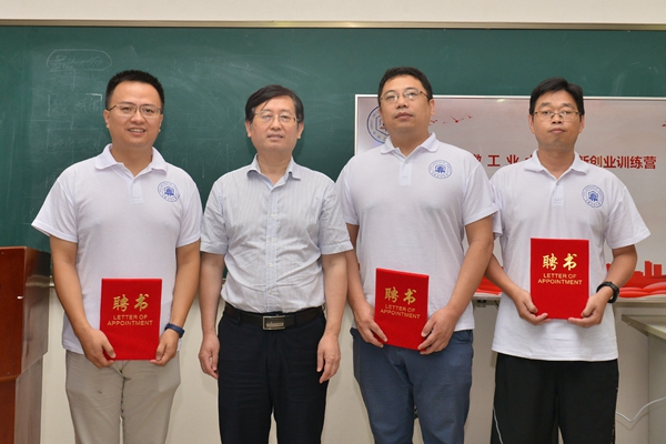 魏先文为创新创业导师颁发聘书,创新教育学院院长黄志甲为创新创业训练营授旗。
