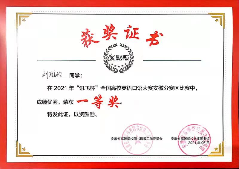 11月3日,2021年度“讯飞杯”全国英语口语大赛安徽赛区总决赛落下帷幕。经过激烈角逐,ac米兰建筑工程学院安202班刘雅玲同学荣获本科组一等奖,图书馆彭璐老师荣获“优秀指导教师”荣誉称号。
