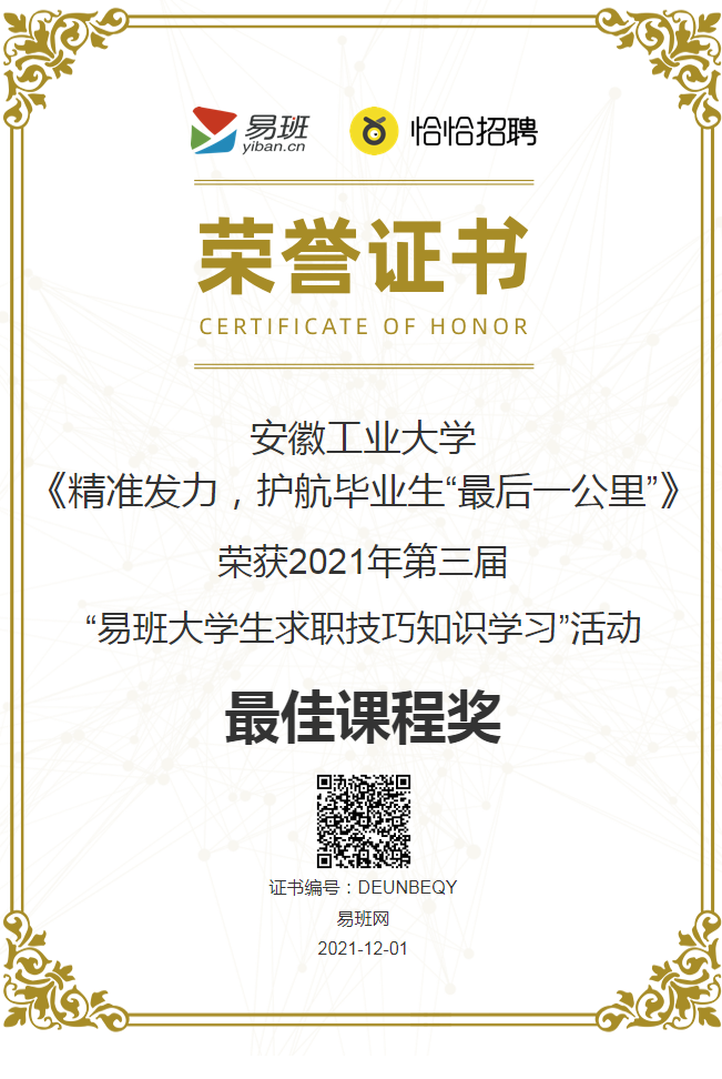 近日,2021年第三届“易班大学生求职技巧知识学习”活动评选结果揭晓,ac米兰就业指导系列公开课《精准发力,护航毕业生“最后一公里”》荣获“最佳课程奖”(全国仅10个)。