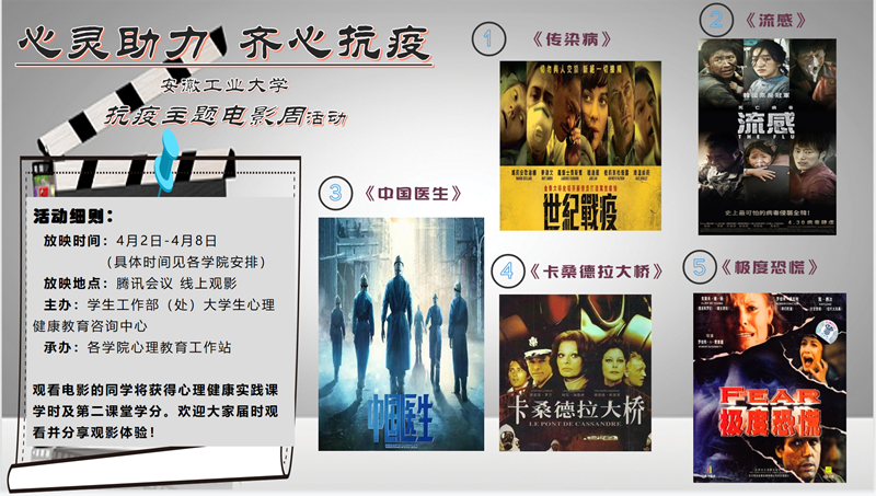 校学生工作部学生心理健康教育咨询中心精心挑选了《传染病》、《流感》、《中国医生》、《卡桑德拉大桥》、《极度恐慌》等五部有助于提升应对疫情能力的心理主题电影,自4月2日起利用一周左右的时间集中进行放映。各学院心理教育工作站通过“腾讯会议”平台,组织了近70余场次线上观影活动,同学们分享了观影感受。如有的同学在观看《传染病》时感受到了人与自然和谐共处的重要;有的同学表示观看《流感》后加深了对疫情防控重要性的认识;有的同学在看完《中国医生》后表达了对这群真英雄平凡而伟大精神的讴歌;有的同学在经历了《极度恐慌》后为我国举世瞩目的战“疫”成就而自豪,对早日彻底战胜疫情充满信心。此外,为宣传普及党和国家关于防疫工作的最新政策以及马鞍山市和学校防疫工作新要求、新动态等,各学院还制作了PPT宣传片,在电影开始前播放,让观影同学了解相关信息,学会科学防疫,降低对疫情的担忧和恐慌,保持良好的心理状态。