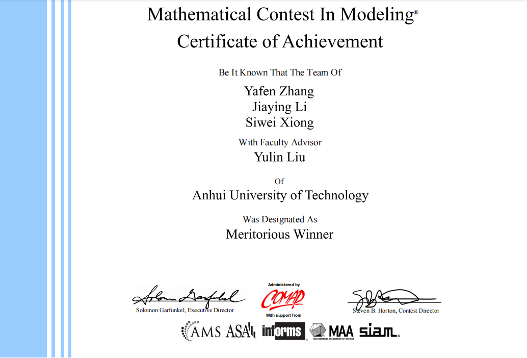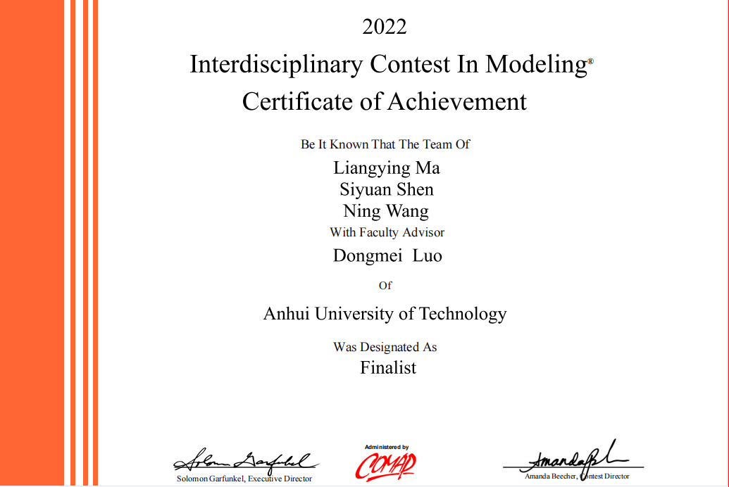 近日,2022年美国大学生数学建模竞赛(Mathematical Contest in Modeling / Interdisciplinary Contest in Modeling,MCM/ICM)结果揭晓。ac米兰33支队伍参赛,共获得特等奖提名奖(Finalist)1项,国际一等奖(Meritorious Winner)2项,国际二等奖(Honorable Mention)8项。其中数理科学与工程学院罗冬梅老师指导,马靓颖、申思源、王宁组成的团队荣获特等奖提名奖,杨辉老师指导,祝栋、乔利、苗栋组成的团队和刘玉琳老师指导,张雅芬、李佳颖、熊思伟组成的团队荣获国际一等奖。