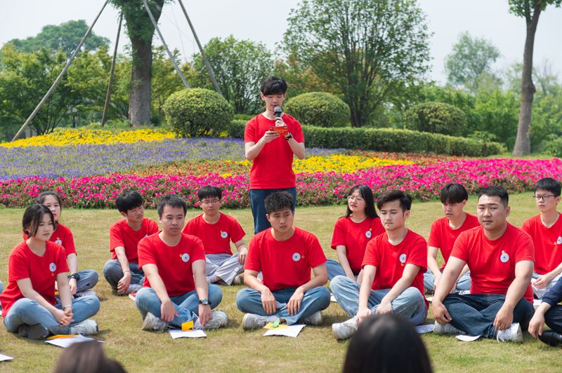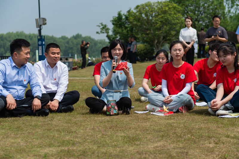 活动期间,同学们围坐江畔草地,开展青春诵读、青春感悟、青春回响研读活动,将对祖国的祝福和对习近平总书记重要讲话精神的学习感悟写在亲手折叠的千纸鹤中。在阳光的映射下,装满千纸鹤的透明玻璃瓶折射出五彩斑斓的光,同学们给这个瓶子起了个好听的名字“青春筑梦瓶”。