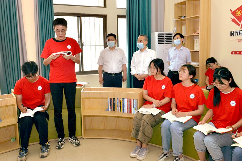 在学校“读团史故事”“手绘团史建筑”展板前,张岳峰对学校以党建促团建“润物细无声”的教育方式予以肯定。他强调,要深入学习贯彻习近平总书记关于教育的重要论述,坚持和加强党对高校的全面领导,全面加强思想政治教育,引导广大青年学生听党话、跟党走,不断开创高校党建和意识形态工作新局面。