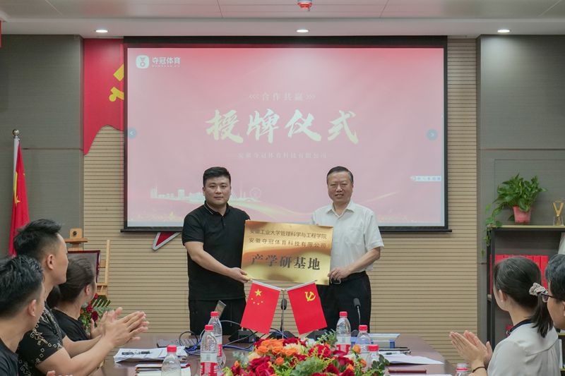 祖明代表学校为陈志栋颁发企业导师聘书,为安徽夺冠体育科技有限公司颁发“ac米兰官方网站产学研基地”牌匾。