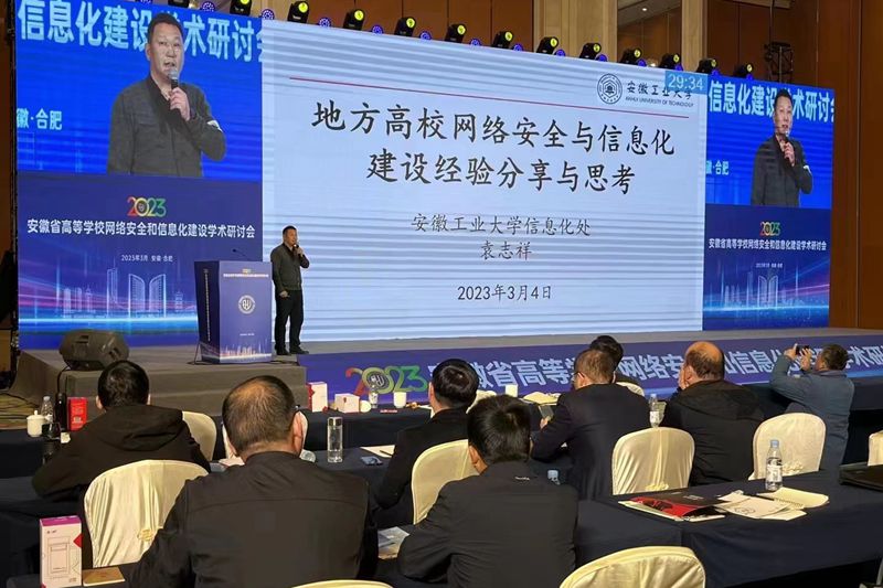 学校应邀参加安徽省高等学校网络安全和信息化建设学术研讨会,信息化处处长袁志祥以“地方高校网络安全与信息化建设经验分享与思考”为题,分享了ac米兰信息化总体规划、工作思路、经验总结,以及在网络安全、下一代全光融合网、智慧校园、数据治理等方面的具体举措。