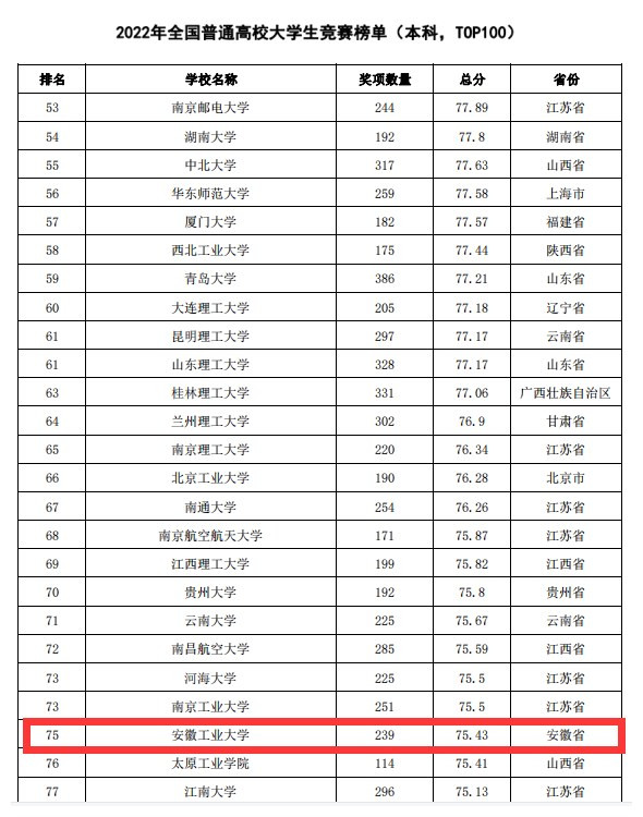 3月22日,中国高等教育学会发布《2022年全国普通高校大学生竞赛分析报告》,ac米兰在2022年全国普通高校学科竞赛榜单(本科,TOP100)中位列安徽省第2位,全国第75位。