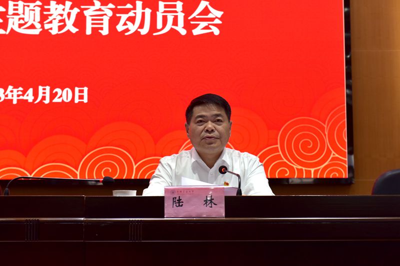 陆林在题为《学思想 强党性 重实践 建新功 奋力推进国内知名特色高水平大学建设再上新台阶》的动员讲话中指出,在全党深入开展学习贯彻习近平新时代中国特色社会主义思想主题教育,是党中央作出的重大决策部署,对于统一全党思想、加强理论武装、解决突出问题、推动事业发展,具有重大意义和深远影响。全校上下要提高政治站位,深刻认识主题教育的重大意义,从政治引领的高度,深刻认识开展主题教育是用习近平新时代中国特色社会主义思想凝心铸魂,筑牢团结奋斗之基的战略安排;从伟大工程的高度,深刻认识开展主题教育是深入推进全面从严治党、不断坚持自我革命,保持解决大党独有难题清醒和坚定的必然要求;从实践需求的高度,深刻认识开展主题教育是积极担当作为、不断开创学校发展新局面的现实需要。要统一思想认识,准确把握主题教育目标要求和主要任务,牢牢把握“学思想、强党性、重实践、建新功”的总要求,紧扣主题教育的根本任务和具体目标。要强化责任担当,认真落实主题教育的重点内容和各项部署,一是把加强理论学习贯穿始终,突出学深悟透;二是把深入调查研究贯穿始终,突出深耕细作;三是把推动高质量发展贯穿始终,突出破解难题;四是把抓好检视整改贯穿始终,突出查改贯通。要加强组织领导,高质量推动主题教育落地见效,压紧压实责任、强化督促指导、加强宣传引导、做好评价评估、发扬严实作风,严格按照党中央、省委的统一部署,在省委第十一巡回指导组的悉心指导下,扎实开展好主题教育工作,以排头兵的姿态、先锋队的担当,牢记嘱托、勇毅前行,坚定不移走好建设国内知名特色高水平大学的奋进之路,为建设现代化美好安徽、建设社会主义现代化国家,全面推进中华民族伟大复兴而团结奋斗。
