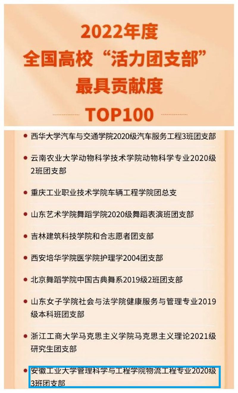 近日,由团中央基层建设部指导、中国青年报社开展的2022年度全国高校“活力团支部”风采展示评选结果揭晓。经过校内选树、校级推荐、省级评比、全国展示等环节,ac米兰材料科学与工程学院2020级材料专业研究生团支部、管理科学与工程学院物流工程专业2020级3班团支部荣获全国高校“活力团支部”荣誉称号。