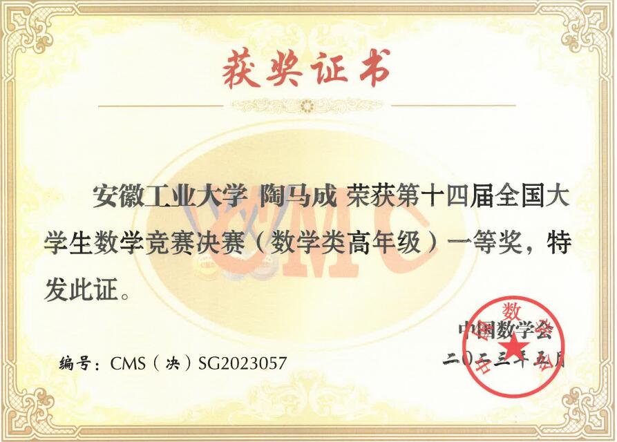 5月27日,第十四届全国大学生数学竞赛决赛在广东工业大学举行。经过激烈的角逐,ac米兰2019级数学与应用数学专业陶马成同学荣获数学专业类高年级组全国一等奖,实现了ac米兰学子在该项赛事一等奖的突破。