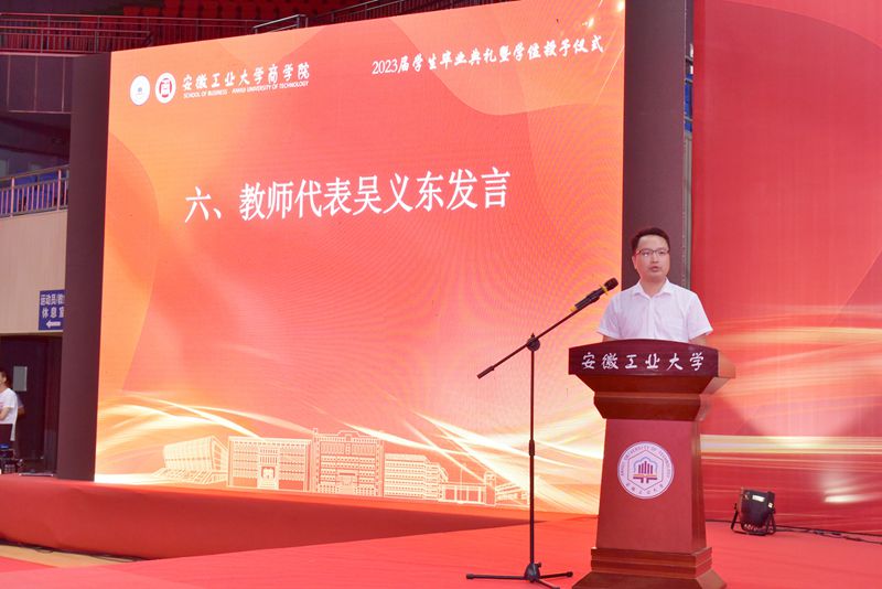 毕业典礼在庄严的国歌声中拉开帷幕。魏先文代表学校向圆满完成学业的毕业生表示祝贺,向辛勤付出的老师们和支持学校工作的学生家长表示感谢。魏先文回顾了商学院在人才培养、学科专业建设、改革创新、社会服务等方面取得的突出成绩,对2023届毕业生在校期间取得的优异成绩表示肯定。他以“挺膺担当,接续奋斗,在强国建设、民族复兴新征程上逐梦前行”为题,寄语毕业生要践行经世济民理念,爱国敬业,志存高远,始终胸怀“国之大者”,树牢“商以富国”和经世济民理念,发扬企业家精神,将聪明才智贯穿于新时代构建新发展格局、建设现代化经济体系、推动高质量发展全过程,以真才实学服务人民、奉献国家,努力在推进强国建设、民族复兴的伟大进程中实现自己的人生价值;要传承商科教育的精髓,勤学善思,明辨笃行,既学会用战略的眼光看问题,又不断适应新的技术和知识,勇于创新,追求卓越,以奋斗姿态在更广阔的舞台上施展才华、竞展风采;要感悟人生幸福的真谛,涵养修为,乐观从容,在奔涌的社会潮流中明辨是非、恪守正道、守住道德底线,在美好岁月面前饮水思源、感恩回报、担当作为,在规划事业发展时乐观自信、勇敢坚毅、脚踏实地,努力做一个有深度、有温度、有高度的人。