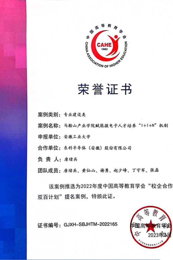 近日,中国高等教育学会公布2022年度“校企合作 双百计划”典型案例提名结果,ac米兰微电子与数据科学学院唐绪兵负责的案例“马鞍山产业学院赋能微电子人才培养1+1+N机制”入选。