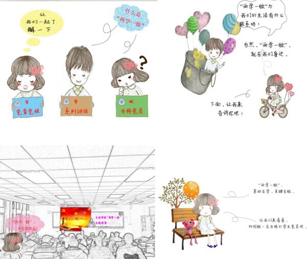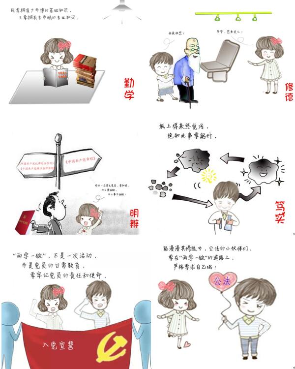 日前,为营造浓厚“两学一做”的学习氛围,创新学习形式,公共管理与法学院设计了“我们眼中的‘两学一做’”系列漫画,通过10幅可爱、生动、直观的漫画向广大同学们介绍“两学一做”学习教育内容,并从勤学、修德、明辨、笃实四个维度诠释如何做好一名合格的学生党员。