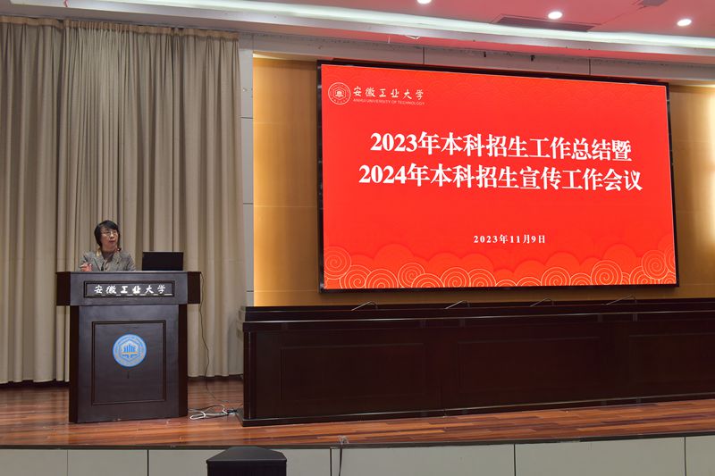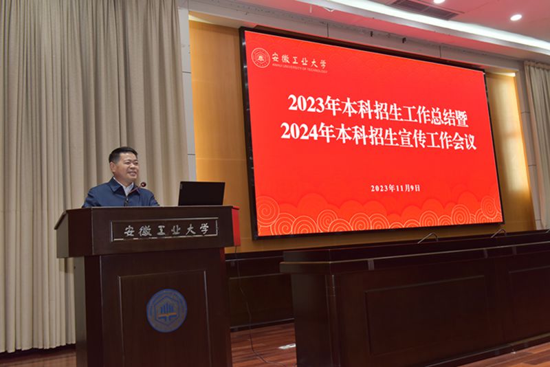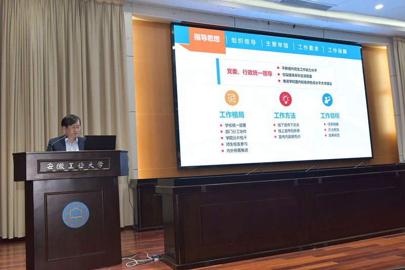 魏先文宣读了2024年本科招生宣传工作方案,从指导思想、组织领导、主要举措、工作要求和保障等方面全面部署,为学校新一轮本科招生工作明确了目标任务、增强了工作动能。魏先文指出,招生宣传是展示学校办学实力的重要窗口,要进一步加强招生宣传工作,擦亮安工大特色品牌,提高学校的声誉和形象,吸引更多的优质生源。一要加强组织领导,强化责任担当。全校上下要强化“生源质量生命线意识”,构建起校院两级科学有效的招生工作领导体制,校院招生宣传领导小组要扛起主体责任,统筹谋划好招生宣传工作,院招生工作小组要切实落实好学校招生宣传工作任务要求。二要强化队伍建设,提升宣传水平。要常态化做好本科招生工作宣讲人员的选拔、培训,构建以专业骨干教师、党政管理人员、在校学生、知名校友等为主的“多元协同”招生宣传队伍,全方位、多维度提升招生工作聚合力。三要注重宣传广度和深度,提升宣传工作实效。要统筹安排好招生走访、与优质生源学校合作、假期间学生宣传实践、招生工作队伍宣传等工作的时间、内容和方式,推进宣传工作的时段全覆盖和片区优质高中全覆盖。举办校园开放日、冬(夏)令营、中学教师进大学、高校高中校长论坛等活动,组织教授名师、优秀学生、杰出校友等到中学开展各类讲座,面对面咨询指导等。四要发挥信息化宣传优势,扩大宣传影响力。要加强学校新媒体平台建设,充分展示办学成就、校情院情、优秀榜样、文化生活、设施条件等。优化校园网招生应用系统,完善相关大数据分析,提升智能解答系统的精准度。五要加强工作考核,强化责任落实。要按照《2024年本科招生宣传方案》工作任务和要求,加强对各单位的考核,对工作履行不到位的单位进行追责,强化责任落实。