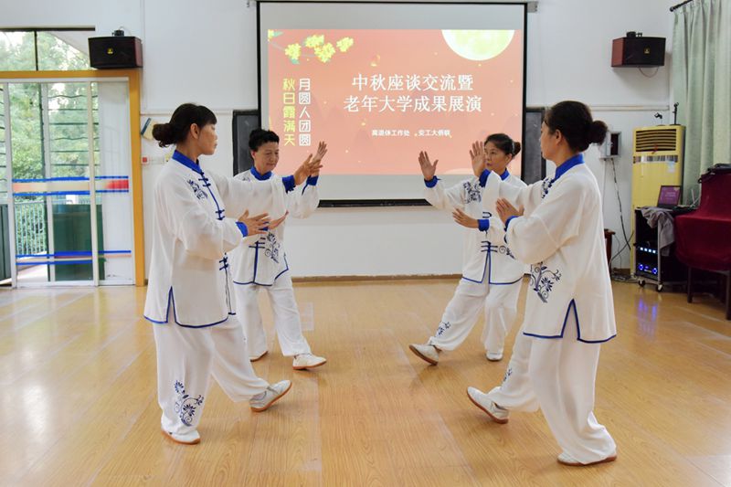 老年大学学习成果展演在葫芦丝班学员一曲悠扬悦耳的葫芦丝合奏《月亮升起来》中拉开帷幕,太极拳班十六式太极拳、二十四式太极扇表演动作舒展大方,舞蹈班《相思谣》、《雨巷佳人》舞姿轻盈优美,时装班《时装秀》演绎不老时尚,老年大学合唱团成员及全体参演老同志合唱的《共筑中国梦》将展演推向高潮。