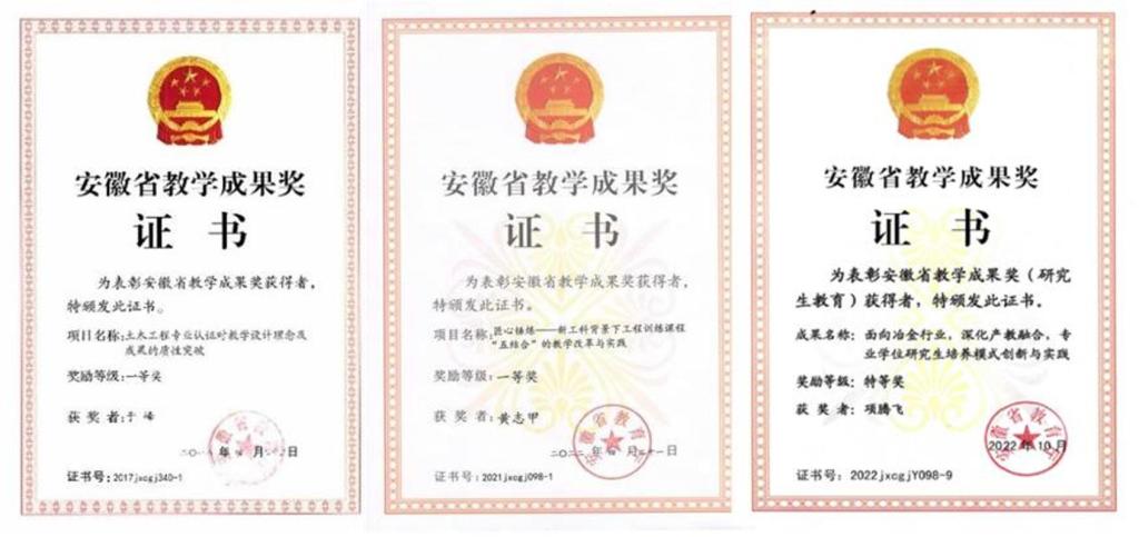 学院2007年被国家人事部、教育部授予全国教育系统先进集体,2011年被安徽省委教育工委授予“安徽省高校先进基层党组织”称号,2021年被安徽省委授予“安徽省先进基层党组织”称号、获批中国科协首批“冶金高校土木工程学科学风传承示范基地”,2023年入选第二批“全省高校党建工作标杆院系”培育创建单位。