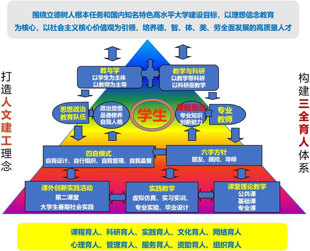 学院坚持以习近平新时代中国特色社会主义思想为指导,在人才培养过程中贯彻“四自”模式和“六字”方针,以“营造优良育人环境,筑就一流土建人才”为办学理念,依托新时代人文建工这一特色品牌,打造“1+3+融合”的“三全育人”模式,构建“思想建设”型、“学业成长”型、“育人解困”型三大育人平台,凝聚合力,不断提升人才培养水平。