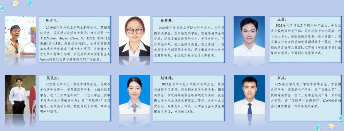 学院专业教师博士化率达95%以上,拥有国家杰出青年科学基金项目获得者、国家重点研发计划首席科学家等国家级人才4人次,安徽省杰出青年基金获得者、安徽省学术和技术带头人等省级人才47人次,省级科研团队3个;学院教师荣获发展中国家科学院化学奖1人、第五届科学探索奖1人、第十二届中国化学会-巴斯夫公司青年知识创新奖1人(全国仅4人)和第四届青山科技奖1人;入选全球前2%顶尖科学家榜单、“中国高被引学者”榜单7人。科研反哺教学效果明显,学院获批煤焦化方向专业课程、无机化学和工程化学省级教学团队3个;学院教师荣获全国模范教师称号1人、全国五一劳动奖章1人、宝钢教育奖4人和省校两级教学名师、教坛新秀9人。