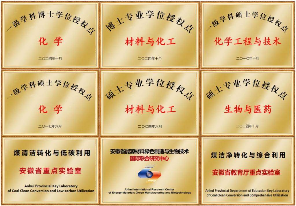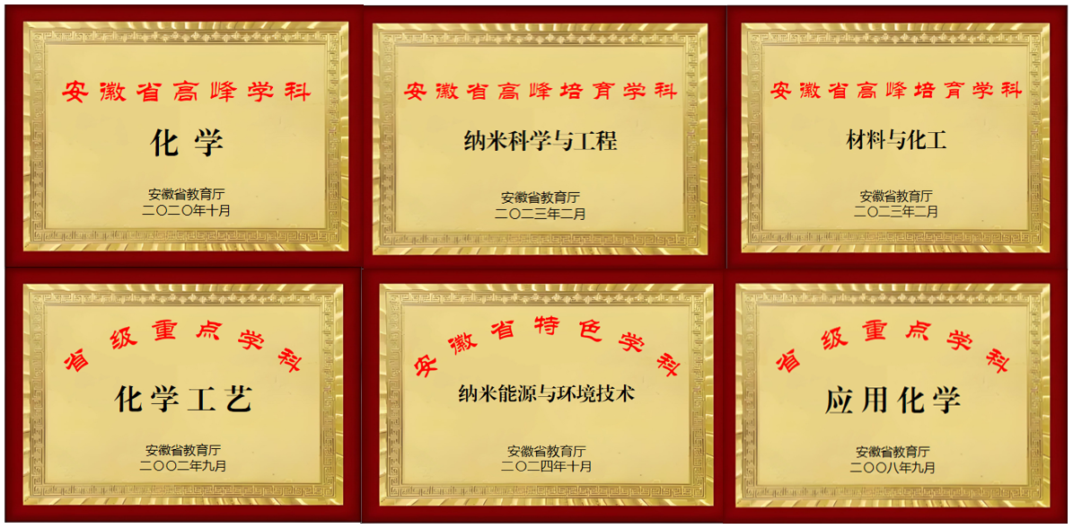 学院现有化学和化学工程与技术一级学科硕士学位授权点2个,材料与化工和生物与医药硕士专业学位授权点2个,化学一级学科博士学位授权点1个,材料与化工博士专业学位授权点1个。化学学科入选安徽省高峰学科,并持续保持ESI排名前0.48%,化学工程入选2024软科世界一流学科排名。纳米科学与工程入选安徽省高峰培育学科,纳米能源与环境技术入选安徽省特色学科。学科引领专业建设屡上台阶,开设的4个本科专业中,获批国家级一流本科专业建设点2个(化学工程与工艺、应用化学),获批安徽省一流本科专业建设点2个(高分子材料与工程、化学生物学),通过工程教育认证专业2个(化学工程与工艺、高分子材料与工程),通过率100%。获批国家级特色专业与卓越工程师培养计划1个,省级特色专业1个,本科留学生招生资格专业1个。