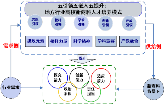 实施“五引领五嵌入五提升”的培养模式。通过将“思政元素”嵌入教育教学链,将“科教融汇”嵌入学科专业链,将“榜样力量”嵌入教学资源链,将“学科竞赛”嵌入人才培养链以及将“产教融合”嵌入行业产业链,让学生充分汲取思政知识、科学精神、榜样力量,培养学生的创新意识,为提高新商科人才培养质量提供了新模式。