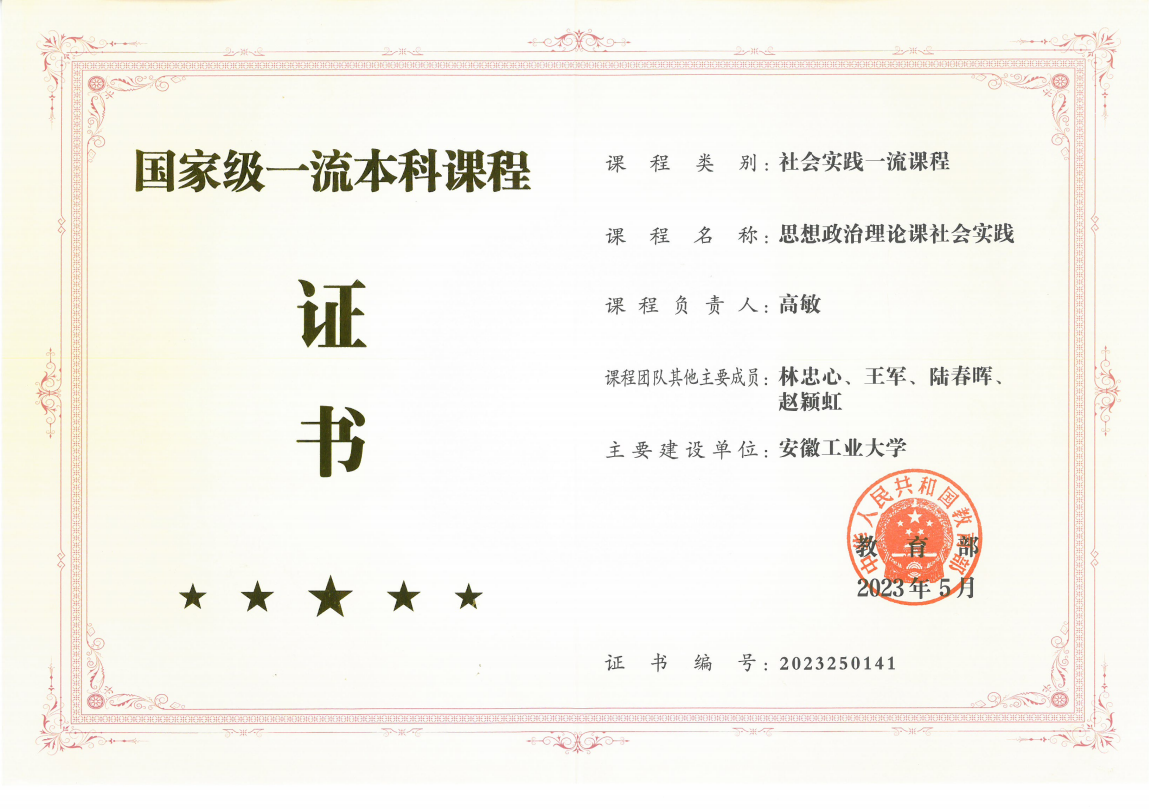 学院大力加强以习近平新时代中国特色社会主义思想为核心内容的思政课程群建设。获批国家级一流本科课程1门、省级精品课程5门,安徽省课程思政建设示范中心、省“大思政课”实践教学基地、高校与“大思政课”实践教学基地结对行动专项等重要项目。获批省级以上教学研究项目37项,其中教育部产学研协同育人项目4项、省级重大项目4项、省级重点项目12项。获批各类质量工程建设项目56项,其中省级21项。获批安徽省“三全育人”暨思想政治能力提升项目25项。获教育部首届全国高校思想政治理论课教学展示活动二等奖,安徽省高校思想政治理论课教师教学展示等省级赛事一等奖5项、二等奖2项、三等奖2项。获安徽省“大学生讲思政课”特等奖2项,一、二、三等奖各1项。