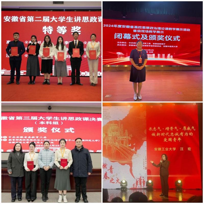教学类竞赛成果显著。获教育部首届全国高校思想政治理论课教学展示活动二等奖,安徽省高校思想政治课教学展示暨教师说课比赛一等奖3项,安徽省普通高校青年教师教学竞赛二等奖2项、三等奖1项,安徽省“同课异构”思政课组一等奖2项,安徽省高校思想政治理论课教师党史说课暨教学展示比赛三等奖,安徽省党史理论微宣讲示范课入选“学习强国”平台展示。学院教师教学案例等素材入选马鞍山市大中小学思政课一体化教学案例,获市精品课展示一等奖、三等奖各1项。获安徽省大学生党史知识竞赛三等奖2项,省“大学生讲思政课”特等奖2项、一等奖1项、二等奖1项、三等奖1项。