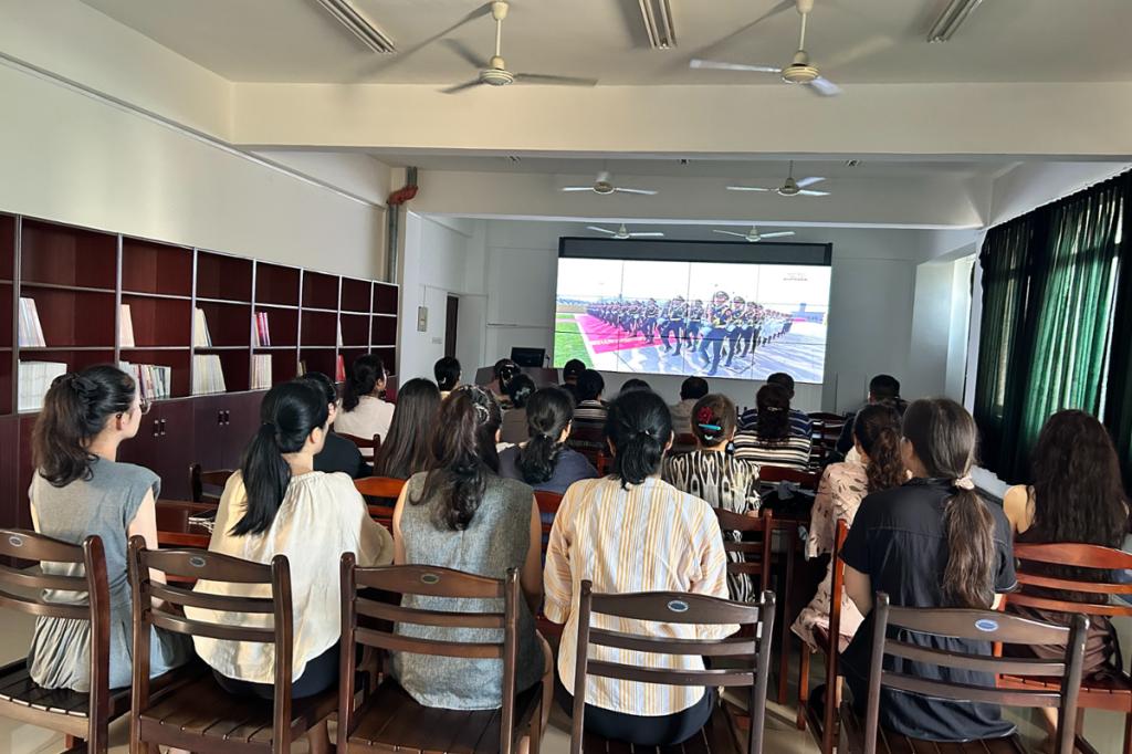 学生工作部部长赵龙表示,今天这场庄严的阅兵仪式是凝聚民族情感、激发爱国热情的盛大仪式,更是一堂生动深刻的爱国主义和国防教育大课。习近平总书记重要讲话中“铭记历史、缅怀先烈、珍爱和平、开创未来”的号召,以及关于中华民族伟大复兴进程势不可挡的论断,为高校思想政治教育注入了磅礴力量。近年来,学校持续加强国防教育和征兵动员,引导青年学生坚定理想信念、锤炼意志品质、踊跃投身军营,把个人成长融入民族复兴伟业。作为学生工作负责人,我们将以更高站位、更实举措、更强担当,持续加强理想信念教育和国防教育体系建设,全面落实立德树人根本任务,促进国防教育与人才培养深度融合,助力国内一流特色高水平大学建设。