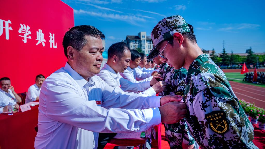 校党委书记陆林与其他校党政领导一起为新生代表佩戴校徽。全体新生将校徽佩戴在胸前,郑重宣读入学誓词。