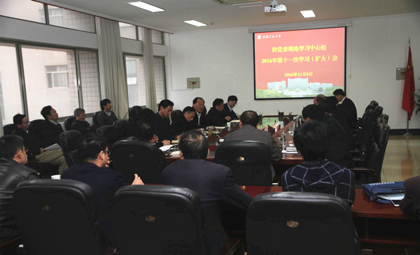 11月8日下午,校党委理论学习中心组召开2016年第十一次学习(扩大)会,学习贯彻十八届六中全会精神和省第十次党代会精神。校党委中心组成员,党委委员、纪委委员,各基层党委(党总支、直属党支部)书记和教务处、财务处、工商学院主要负责人参加了会议。校党委书记刘新跃主持学习会。