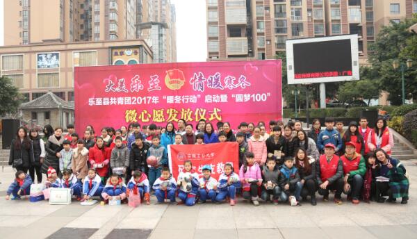 2016年12月30日,由共青团乐至县委主办、研究生支教团承办的2017年“暖冬行动”启动暨“圆梦100”微心愿发放仪式在乐至县寇公广场举行。支教团队员吴保林、吴慧辉忙着将崭新的书包、书籍,篮球、乒乓球拍,玩具熊娃娃、滑板等心愿礼物送到孩子们的手中。“我的心愿是有一个玩具熊娃娃,今天支教团大哥哥帮我实现了,很感谢他们!”来自童家镇中心小学的刘歆美抱着玩具熊开心地说。“希望孩子们能努力学习,将来成为有用之才,回报社会!”爱心人士宋志刚夫妇来到活动现场为孩子们赠送书包、书籍等心愿礼物。“‘圆梦100'微心愿认领活动启动以来,得到了社会各界的广泛关注和支持,100名同学的小小心愿被迅速认领一空。”乐至县团县委书记叶琳说。