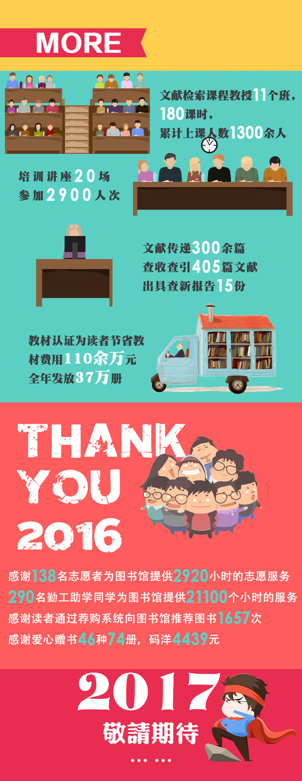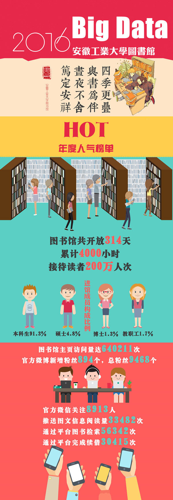 图书馆“2016年度大数据”由“人气榜单”、“流通榜单”等多个板块组成,内容丰富,涵盖开放安排、读者接待、资源利用、讲座培训等全年主要服务数据、馆藏数据和用户数据,全方位呈现出图书馆一年来服务理念及服务质量的大幅提升。
