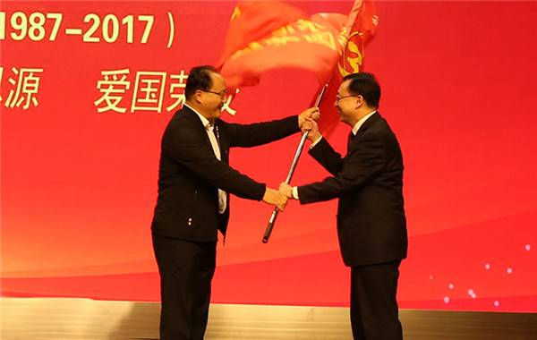 会上,刘新跃向下一届校友毕业30周年返校活动筹备组校友代表李德斌授“饮水思源·爱国荣校”会旗。