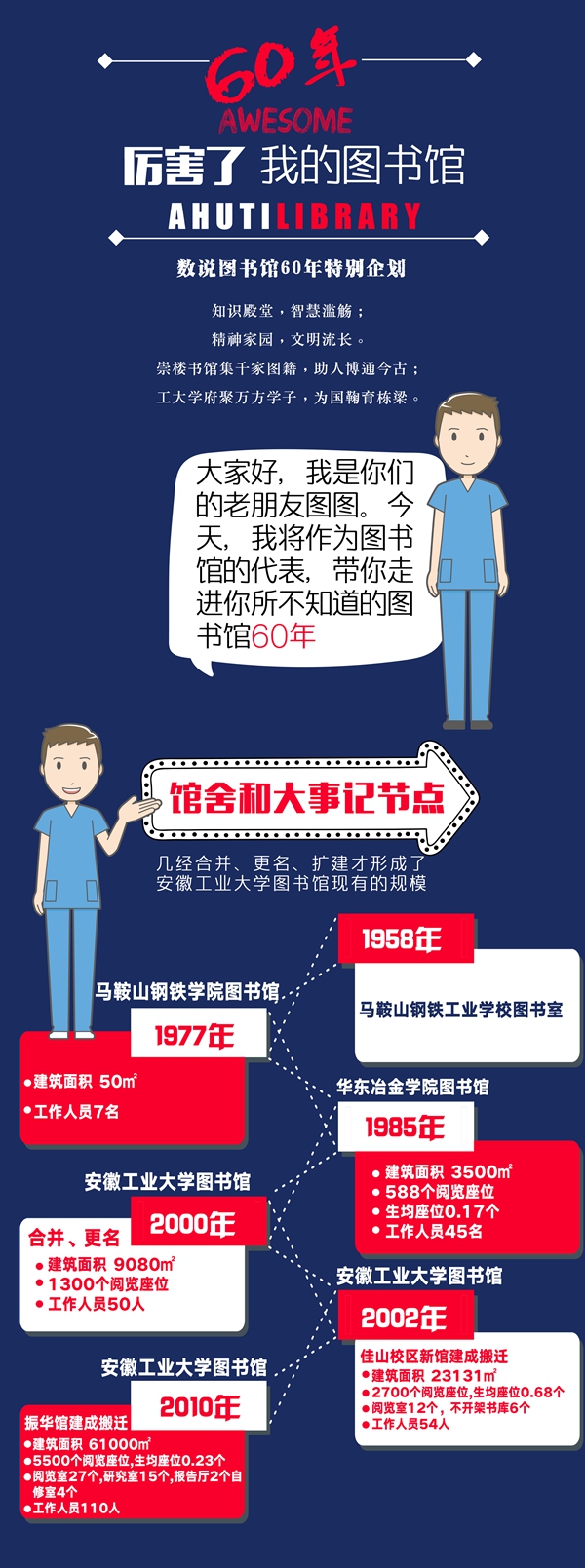 60载春花秋实。图书馆是学校的一张立体的名片,“读者第一,服务至上”宗旨始终没有改变。今天,图书馆用数据及图表的方式细数60年发展变化,向广大师生校友汇报,向学校60周年庆献礼。(李蒋 璐璐 审核:唐忠 邹珏)
