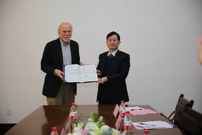 3月15日,引力波的发现者、2017年诺贝尔物理学奖获得者之一、美国加州理工大学教授巴里·巴里什(Barry ClarkBarish)应邀来ac米兰讲学并被ac米兰聘为荣誉教授。校长魏先文、副校长顾明言会见了巴里什教授,省科技厅引进国外智力与科技人才管理处处长胡光,马鞍山市科学技术协会、科学技术局等单位的负责人,ac米兰国际合作与交流处、机械工程学院、创新教育学院等有关单位负责人参加了会见。