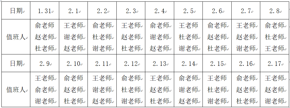 2020年1月30日起至开学,每天09:00-18:00。(2月17日后值班表另行安排)
