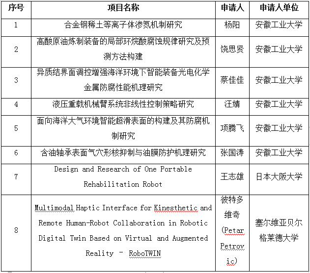 根据《特殊服役环境的智能装备制造国际科技合作基地开放基金管理办法》,基地于2021年11月10日发布了《特殊服役环境的智能装备制造国际科技合作基地2021年度开放基金申请指南》,并接收项目申请。共收到有效申请14项,经国合基地技术委员会专家评审,拟立项并资助其中8个项目。现公示如下: