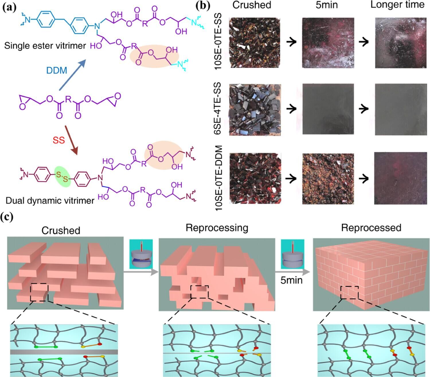 传统的热固性材料如环氧树脂和橡胶等在生活中应用广泛,但它们破坏后无法循环使用,造成环境污染和资源浪费。该材料可通过调节芳香族和脂肪族单体的比例来实现橡胶态和玻璃态的转变,在高温条件下5分钟内快速再次成型和回收,为热固性塑料的快速回收及再生利用提供了思路。