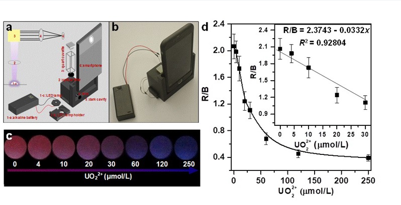 此外,团队结合智能手机APP颜色识别器完成了铀酰离子的现场可视化和定量化检测。该比率荧光探针由蓝色和红色碳点通过合适的比例混合得到,铀酰离子存在时红色碳点荧光被猝灭而蓝色碳点荧光不变,从而在紫外灯照射下观察到明显的由红到蓝的颜色变化。利用智能手机识别荧光探针溶液的颜色RGB值即可实现铀酰离子的现场可视化和定量化检测,整个检测过程在5分钟内即可完成。该研究为发展荧光试纸在环境、医药、食品、疾病诊断及公共安全等领域中的应用提供了新的思路和方法。