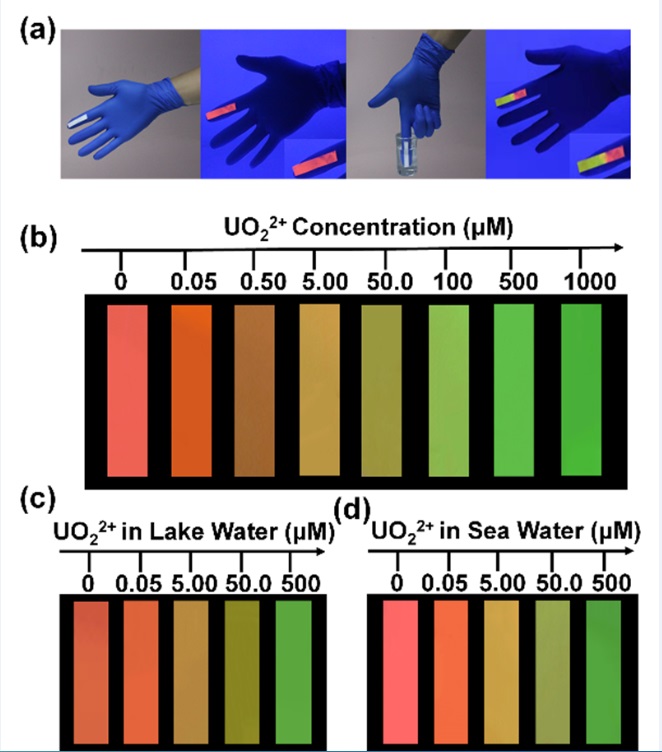 宽浓度铀酰离子的荧光比率试纸对纯水(b)、湖水(c)和海水(d)中等铀酰离子的检测
