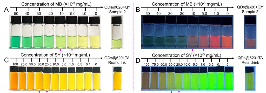 丰富的不饱和结构使得FDs通常具有强的紫外-可见光吸收能力,而大多数FDs本身不具备荧光发射行为,考虑到FDs的荷电性质,课题组利用羧基带帽CdTe量子点(QDs)设计开发了基于内滤效应(IFE)的通用型FDs多模可视化平台用于FDs的裸眼半定量即时检验,包括QDs试剂盒和QDs掺杂的荧光检测试纸等。由于IFE检测体系具有浓度依赖性,仅依靠FDs的光吸收性质与QDs的荧光激发/发射带之间的谱学重叠即可实现荧光响应,无需FDs与QDs之间发生直接的相互作用,因此荧光响应过程可在瞬间完成,使得整个检测过程在10 s(试剂盒)或1 min(试纸)内便可结束。不同于传统单一信号源的可视化方法,集表观颜色、荧光颜色和智能手机数字化图像分析技术于一体的多模可视化分析技术,其各分析通道可单独运行,亦可多模协同工作,这种不同分析通道间分析结果的相互验证大大提高了可视化分析技术的可行性与可靠性,实验证明多模可视化技术的直读结果与多种经典仪器分析技术的测定结果高度吻合。