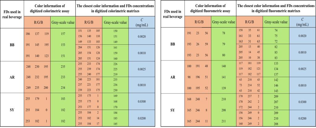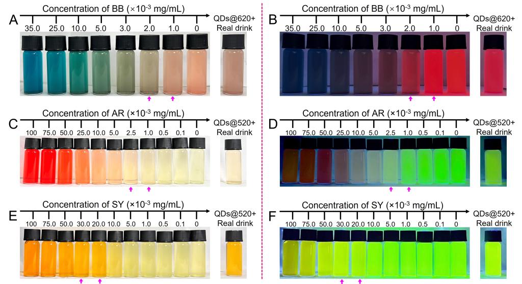 (实际饮料中FDs比色(A,C,E)和荧光比色(B,D,F)分析)