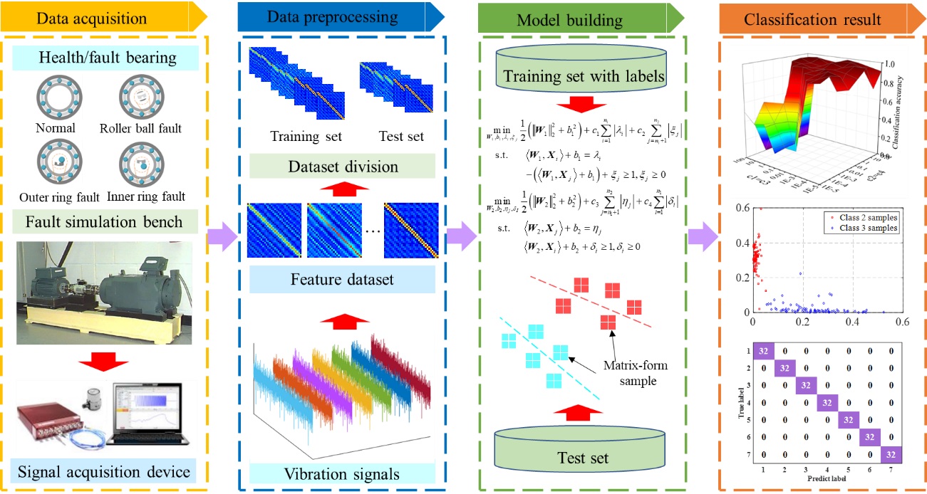 设备故障特征提取与智能识别是故障诊断的关键步骤。本研究提出了一种基于矩阵数据的智能识别方法——非平行有界支持矩阵机(NPBSMM),通过构造一对约束范数组并将其应用于模型,不仅抑制了异常特征对模型的负面影响,同时提高了NPBSMM的稀疏性;采用多秩左右投影矩阵建立目标函数,不仅能够有效地提取矩阵隐藏的结构化信息,同时能够提高NPBSMM的拟合能力和鲁棒性。本研究从噪声鲁棒性、模型效率及大规模数据等方面综合考量和验证了模型性能,为机械装备及其关键部件故障智能识别与诊断提供新思路。