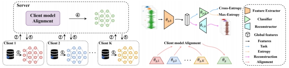 针对跨位置非同独立分布问题,团队提出了一种全局特征与个性化特征解耦的个性化联邦故障诊断框架DecFFD。在DecFFD中,为每个客户端设计了一个重构器,充当监管器和解耦器,以解缠全局和个性化特征,并提出一种客户对齐算法,以消除客户之间的全局特征差异。团队对公平性和泛化能力进行了理论分析,为模型收敛性提供了理论保证,并在两个真实数据集上进行了广泛的实验。研究结果不仅进一步推进了联邦故障诊断的实际应用,还为智能物联网环境下异构数据跨域协同学习提供新的思路和方法。
