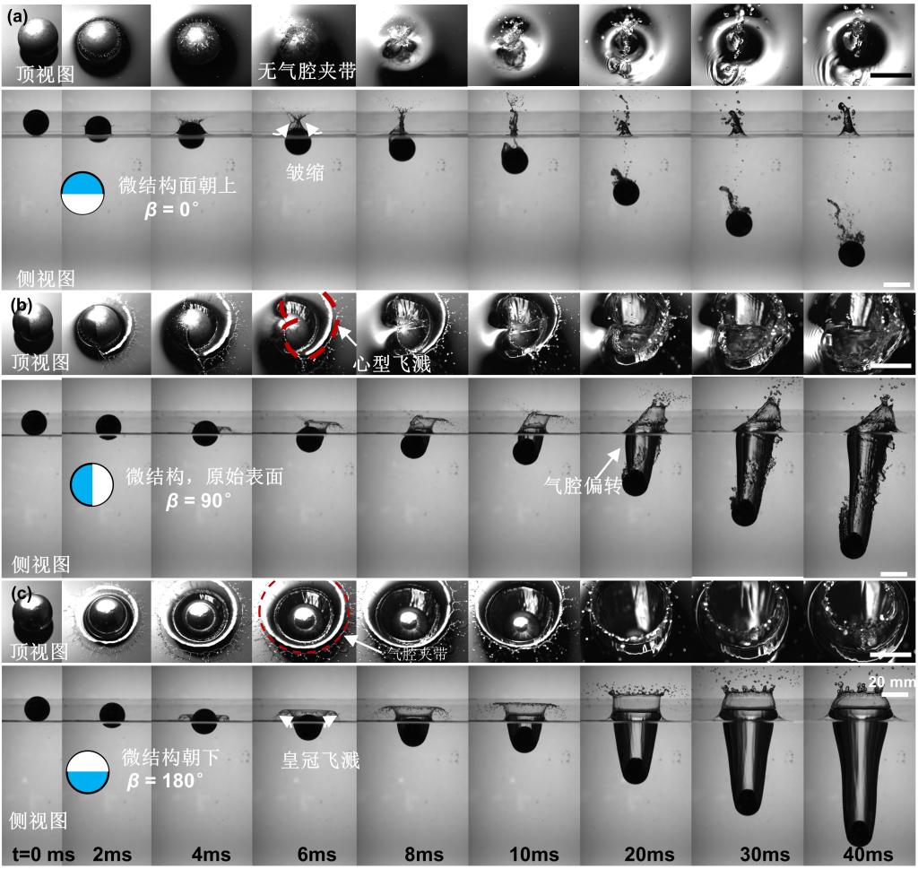 此外,分析表面微观形貌对液膜飞溅的影响机制模型是开展固-液界面减阻气腔构筑机制中的关键科学问题,团队研究了考虑表面形貌效应的球体入水动力学特性,分析了微结构面积占有率不同的球体垂直入水多相流动过程,并从能量角度揭示了非对称入水气腔偏转机制。形成的入水气腔能够将表面无滑移边界条件转变成气-液界面自由滑移边界条件,显著降低流体阻力,通过调控表面形貌产生的非对称入水气腔为跨介质航行器入水提供了一种新的策略。相关工作发表在《中国科学:物理学力学天文学》,ac米兰为论文第一完成单位,王兆长博士为论文第一作者,童宝宏教授为论文通讯作者。